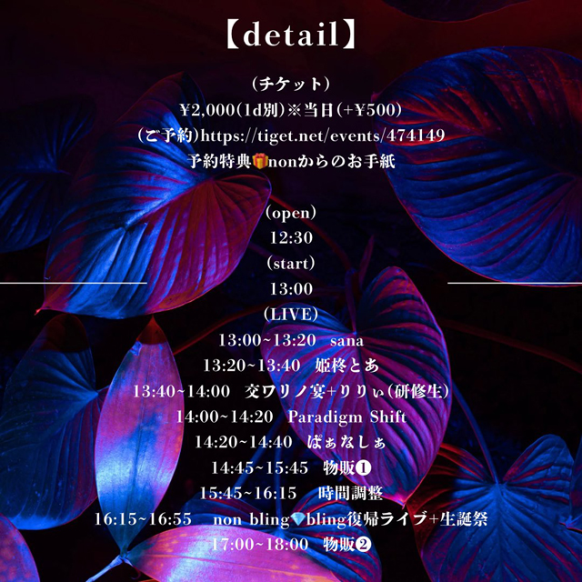 ※イベント実施当日または事前にメンバー及び関係者に体調不良者などが万が一出た場合、イベントの開催を中止あるいはメンバーの変更などを行う場合があります。その際のキャンセルにつきましてはお気軽にお申し付けください